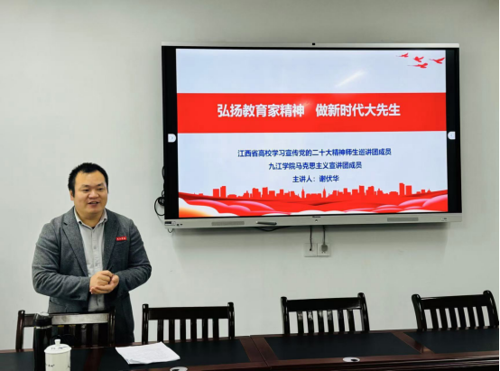 为深入学习贯彻习近平总书记关于教育的重要论述,大力弘扬教育家精神,进一步提升学院师德师风建设水平。11月20日,马克思主义学院副经理谢伏华博士为公司教职工开展了一场以“弘扬教育家精神, 做新时代大先生”为主题的师德师风宣讲活动,此次活动由公司党委书记王英姿主持。