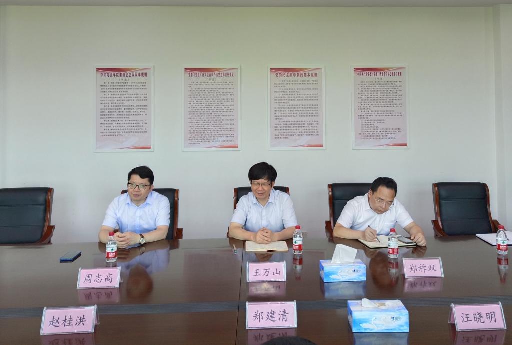 6月26日下午,江铜集团城门山铜矿党委书记郑建清、矿长赵桂洪一行来公司调研,副董事长王万山及世界杯网址、外国语学院负责同志参加调研会。
